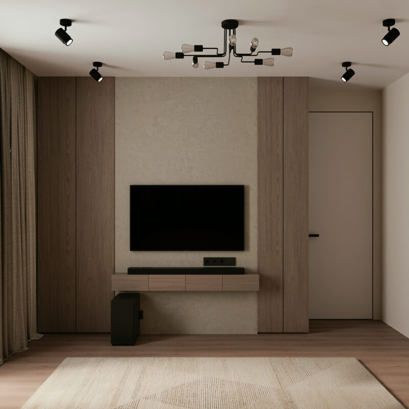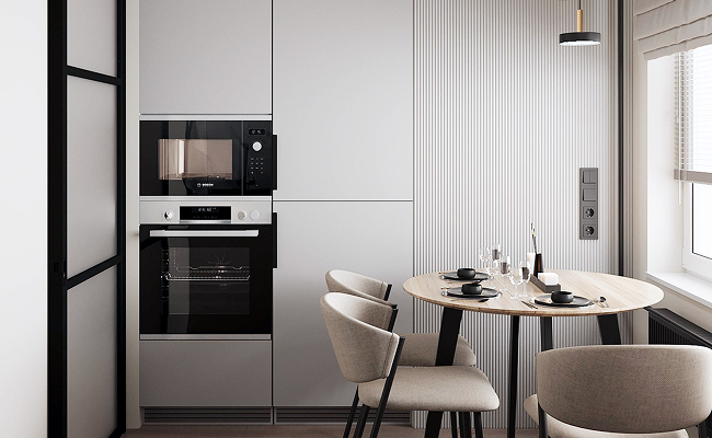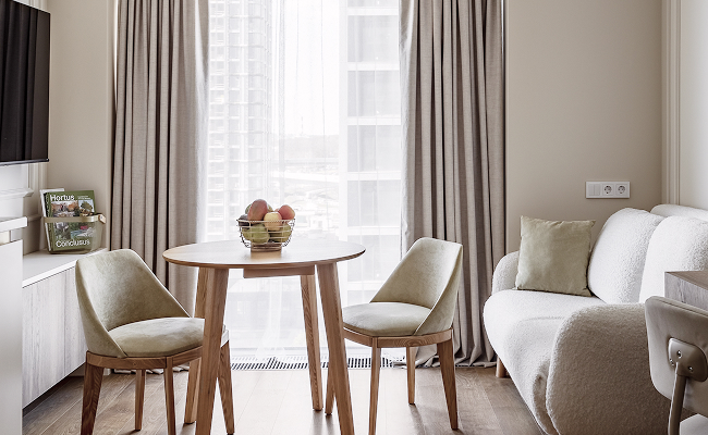 Квартира выполнена в современном стиле с яркими деталями, совмещая в себе элементы хай тека и неоклассики.